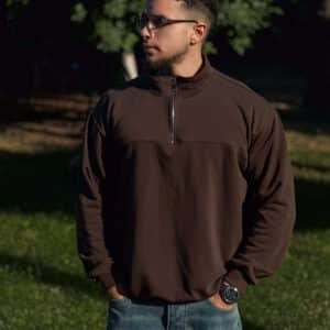 • Details: Quarter zip closure, stand-up collar, ribbed cuffs & hem