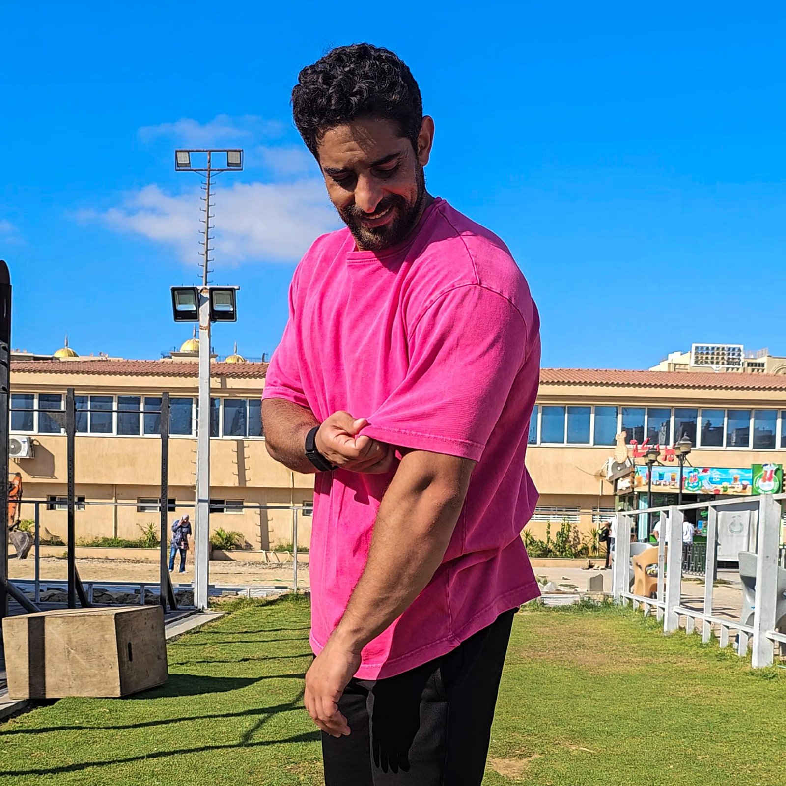 - Adult Men model Sobhy, 174 cm / 88 kg — wears size L for an oversized fit